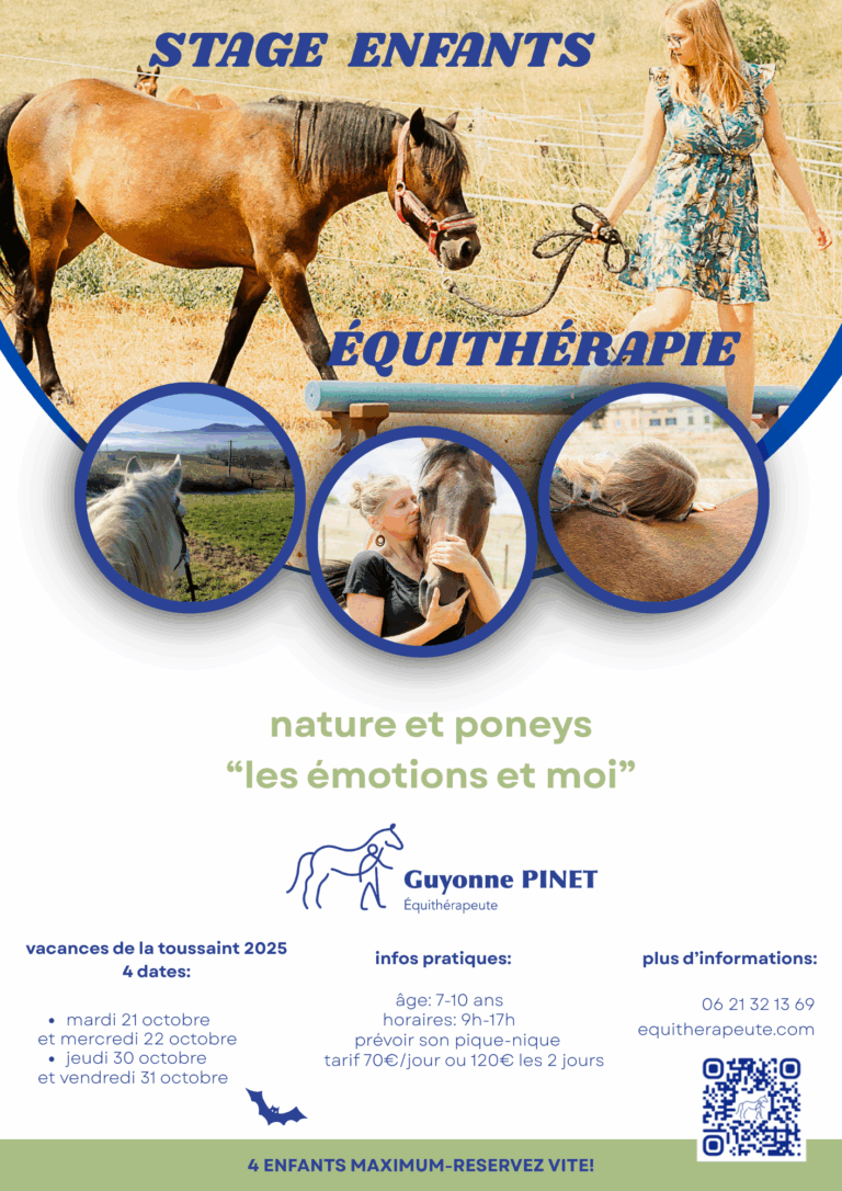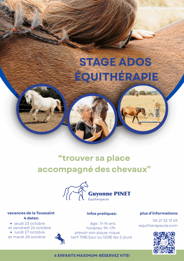 Pendant les vacances scolaires, proposez à votre enfant une expérience unique d’équithérapie en petit groupe à Sarcey. Ces stages sont une occasion privilégiée de se reconnecter à soi, à la nature et au monde fascinant du cheval, dans un environnement authentique au plus près des chevaux. Il est important de noter que ces stages ne sont pas des cours d’équitation et ne prévoient pas de monte.